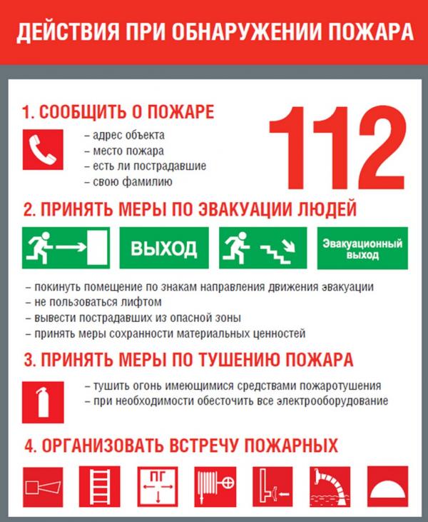 1. Немедленно сообщи о пожаре по телефону «101» или «112», укажи точный адрес, место возникновения пожара и свою фамилию.