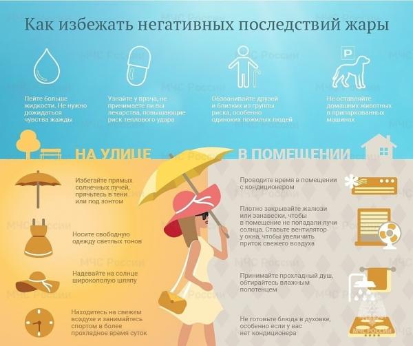 Необходимо знать симптомы теплового и солнечного удара. Это в первую очередь такие признаки, как слабость, вялость, головокружение, сильное потоотделение, жажда, головная боль, тошнота и рвота. В особо тяжёлых случаях возможна потеря сознания. Если человек перегрелся, и у него наблюдаются вышеперечисленные симптомы, необходимо незамедлительно обратиться к врачу и провести мероприятия по охлаждению организма. Пострадавшего нужно уложить в прохладном месте, на голову положить холодный компресс или влажное полотенце. Если пострадавший в сознании, дать ему обильное питьё, если нет, то приводить в чувство с помощью нашатырного спирта и ждать приезда бригады скорой помощи.